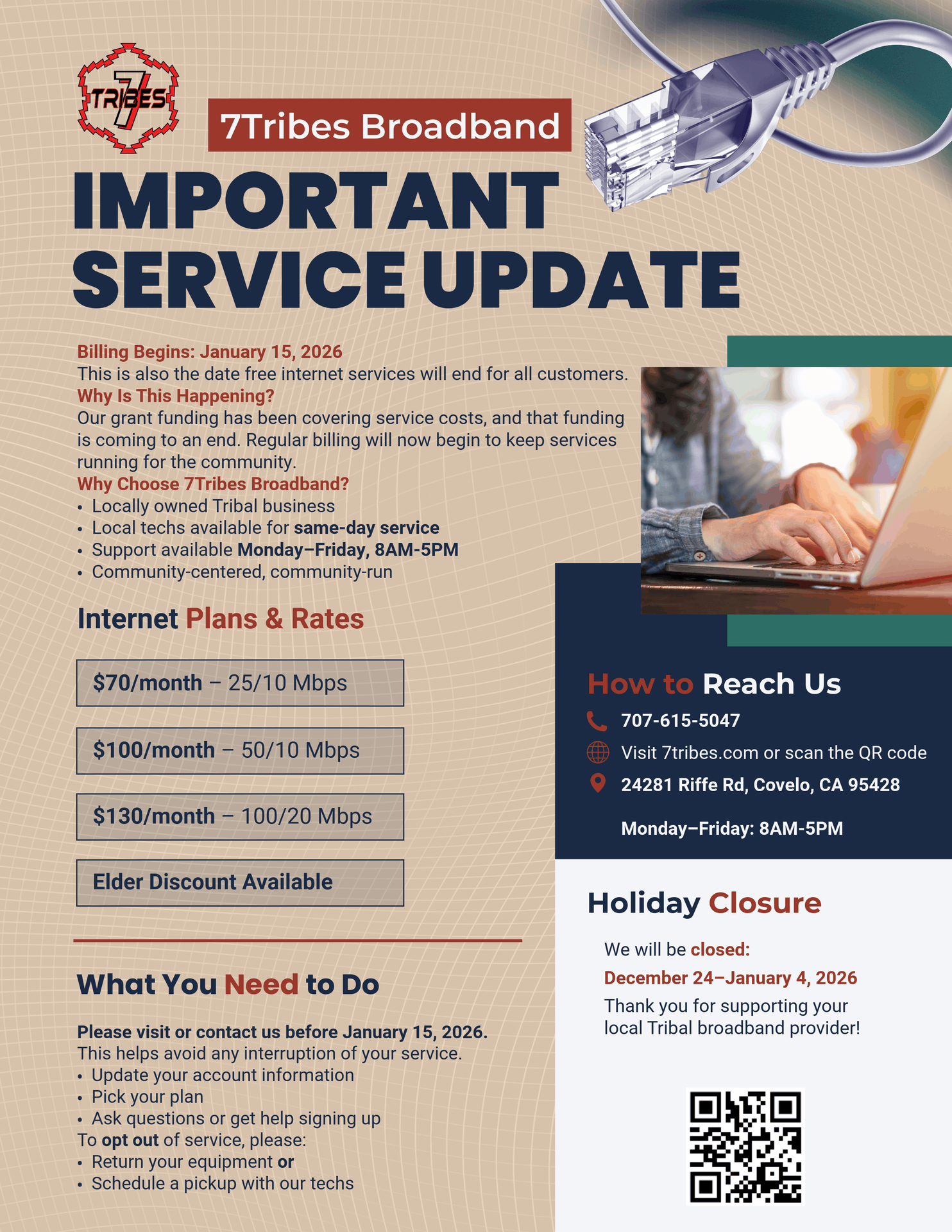 Beginning January 15, 2026, 7Tribes Broadband will transition from grant-funded service to regular monthly billing. This date also marks the end of free internet services for all customers. As our grant funding concludes, moving to standard billing ensures we can continue delivering reliable, community-focused connectivity.